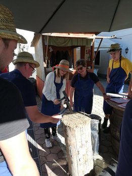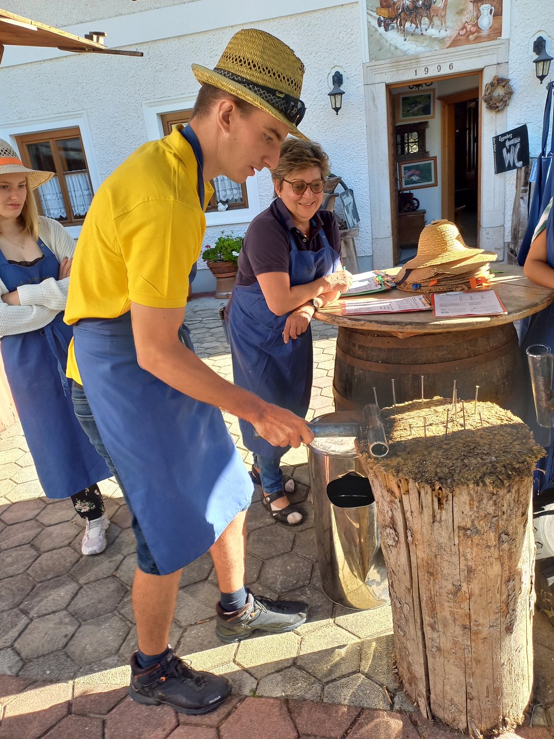 Für alle bis auf die beiden Reiseleiter war das Ganze eine Fahrt ins Blaue. Diese startete um 0700 in Richtung Schlierbach. Dort hatten wir unsere erste Station mit der „Kremstaler Landmatura“ auf dem Hof der Familie Weingartner. Diese beinhaltete Aufgaben wie Melken, Radlbock fahren, Pflanzenkunde, Most und Schnapsverkostung oder auch Bauernkrapfen backen. Es haben alle die Landmatura bestanden und so gab für zum Abschluss ein Bratl in der Rein.